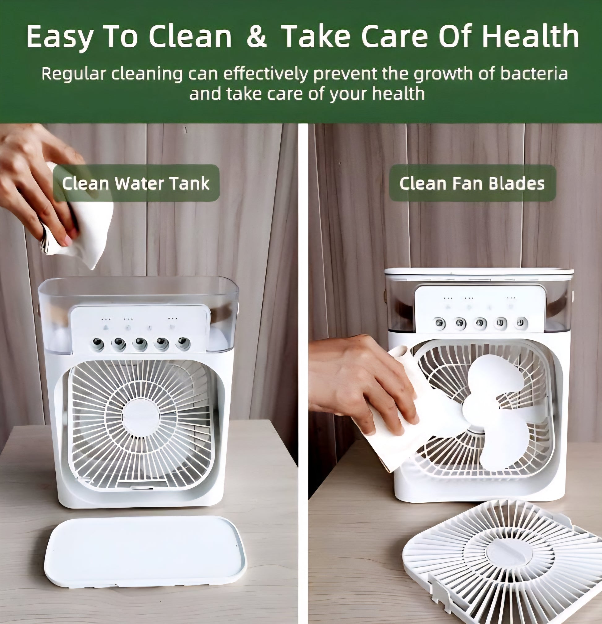 with the provided USB data cable, and feel the immediate cooling effect. Compatible with any USB power source, including power banks, it's perfect for use both indoors and outdoors. Energy Efficient and Eco-Friendly: With energy efficiency at its core, this air cooler operates on low power consumption, saving costs and minimizing environmental impact. Just a simple water refill ensures hours of cooling comfort powered by USB